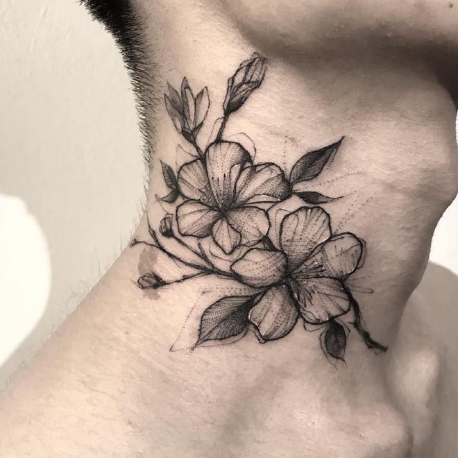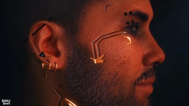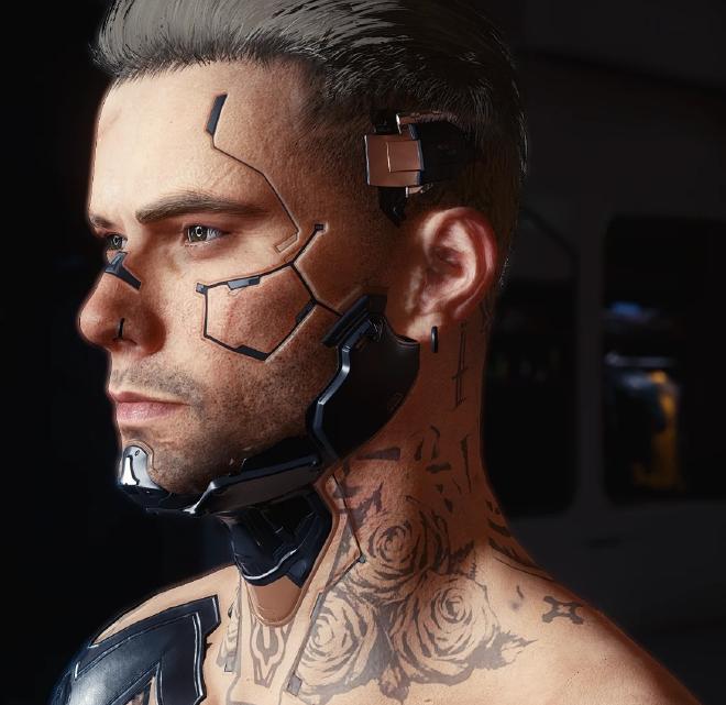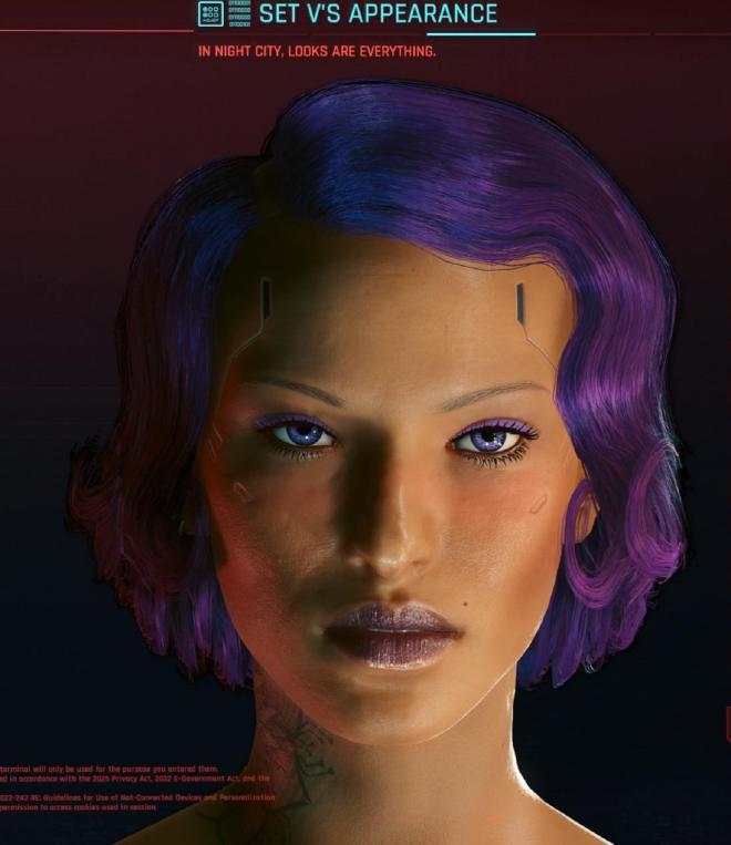 My Character V from Cyberpunk 2077 - use as starting pointWould like this part of the jaw to be black metallicExample of traces in face with gold/silver/black metallics or fleshI like the contrast of her bright waterline and eyelashes against the dark eye makeupVibes - but in purplesInspo for ear piercingsSize reference for neck tattoo, but would want it coloredInspo for back tattoo - redder plum blossoms